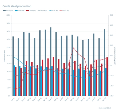 2023年3月,中國粗鋼產(chǎn)量為9573萬噸,同比提高6.9%;印度粗鋼產(chǎn)量為1140萬噸,同比提高2.7%;日本粗鋼產(chǎn)量為750萬噸,同比下降5.9%;美國粗鋼產(chǎn)量為670萬噸,同比下降2.1%;俄羅斯粗鋼預(yù)估產(chǎn)量為660萬噸,同比提高0.4%;韓國粗鋼產(chǎn)量為580萬噸,同比提高1.9%;德國粗鋼預(yù)估產(chǎn)量為330萬噸,同比下降0.5%;巴西粗鋼產(chǎn)量為270萬噸,同比下降8.7%;土耳其粗鋼產(chǎn)量為270萬噸,同比下降18.6%;意大利粗鋼產(chǎn)量為220萬噸,同比提高2.7%。