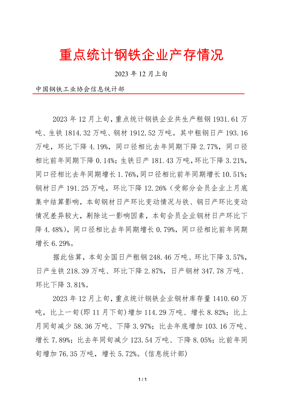 中鋼協(xié)數(shù)據(jù)顯示,2023年12月上旬,重點統(tǒng)計鋼鐵企業(yè)共生產(chǎn)粗鋼1931.61萬噸、生鐵1814.32萬噸、鋼材1912.52萬噸。其中粗鋼日產(chǎn)193.16萬噸,環(huán)比下降4.19%,同口徑相比去年同期下降2.77%,同口徑相比前年同期下降0.14%;生鐵日產(chǎn)181.43萬噸,環(huán)比下降3.21%,同口徑相比去年同期增長1.76%,同口徑相比前年同期增長10.51%;鋼材日產(chǎn)191.25萬噸,環(huán)比下降12.26%,同口徑相比去年同期增長0.79%,同口徑相比前年同期增長6.29%。