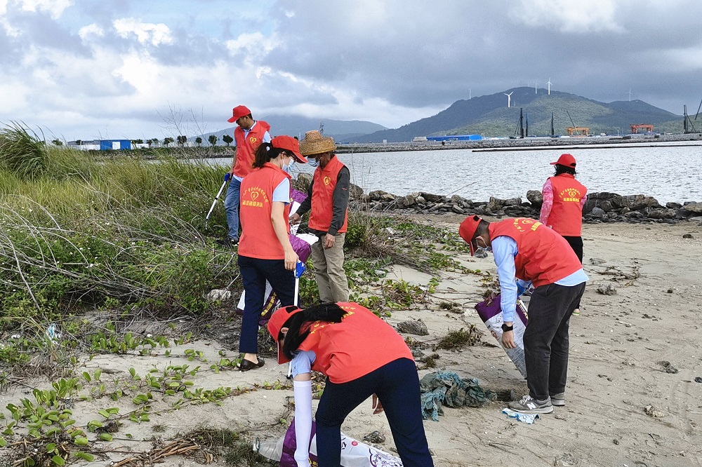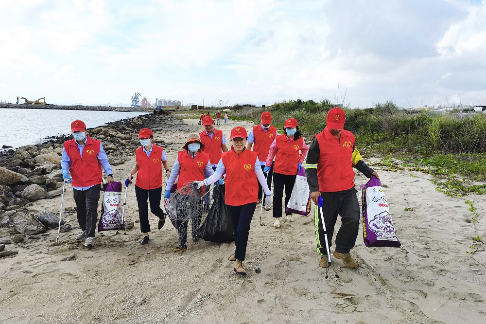 活動中,黨員、志愿者們分工合作、互相配合,在陽江港19#碼頭外沿海灘清理海洋垃圾。他們身穿紅馬甲,迎著海風(fēng),頂著烈日,手持編織袋、垃圾夾等清理工具,不怕臟、不怕累,認(rèn)真撿拾海岸邊的飲料瓶、塑料制品、泡沫箱、破漁網(wǎng)和其他小型廢物品,一個個忙碌的身影成為了海邊最亮麗的風(fēng)景線。