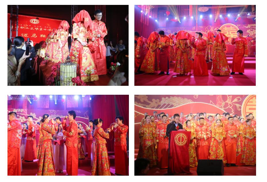 在這愛意濃濃,闔家歡樂的日子里,青拓集團的10對新人懷揣著喜悅的心情早早來到活動現(xiàn)場梳妝打扮,戴頭花、蓋上蓋頭……待新人們一切準備工作就緒后,19時30分,婚禮儀式正式拉開帷幕,新娘頭蓋蓋頭,新郎用大紅綢花牽引新娘入場,期間跨火盆、邁馬鞍,寓意生活興旺蓬勃,前來參加婚禮的家長和親朋好友們,忍不住為他們鼓掌喝彩。隨后新人們步入婚禮舞臺中央,伴著歡喜的歌聲,婚禮到了掀蓋頭環(huán)節(jié),新郎先用秤桿挑去新娘的紅蓋頭,寓意“稱心如意”,隨后進行“三拜”禮、結發(fā)禮,最后新人們在祝福聲中共飲合巹酒,簽訂愛的婚約,地道的傳統(tǒng)中式婚禮儀式一一呈現(xiàn),掌聲、歡笑聲此起彼伏。隆重簡約的儀式,豐富的傳統(tǒng)文化內(nèi)涵,讓新人們留下了人生中最獨特、美好的記憶。