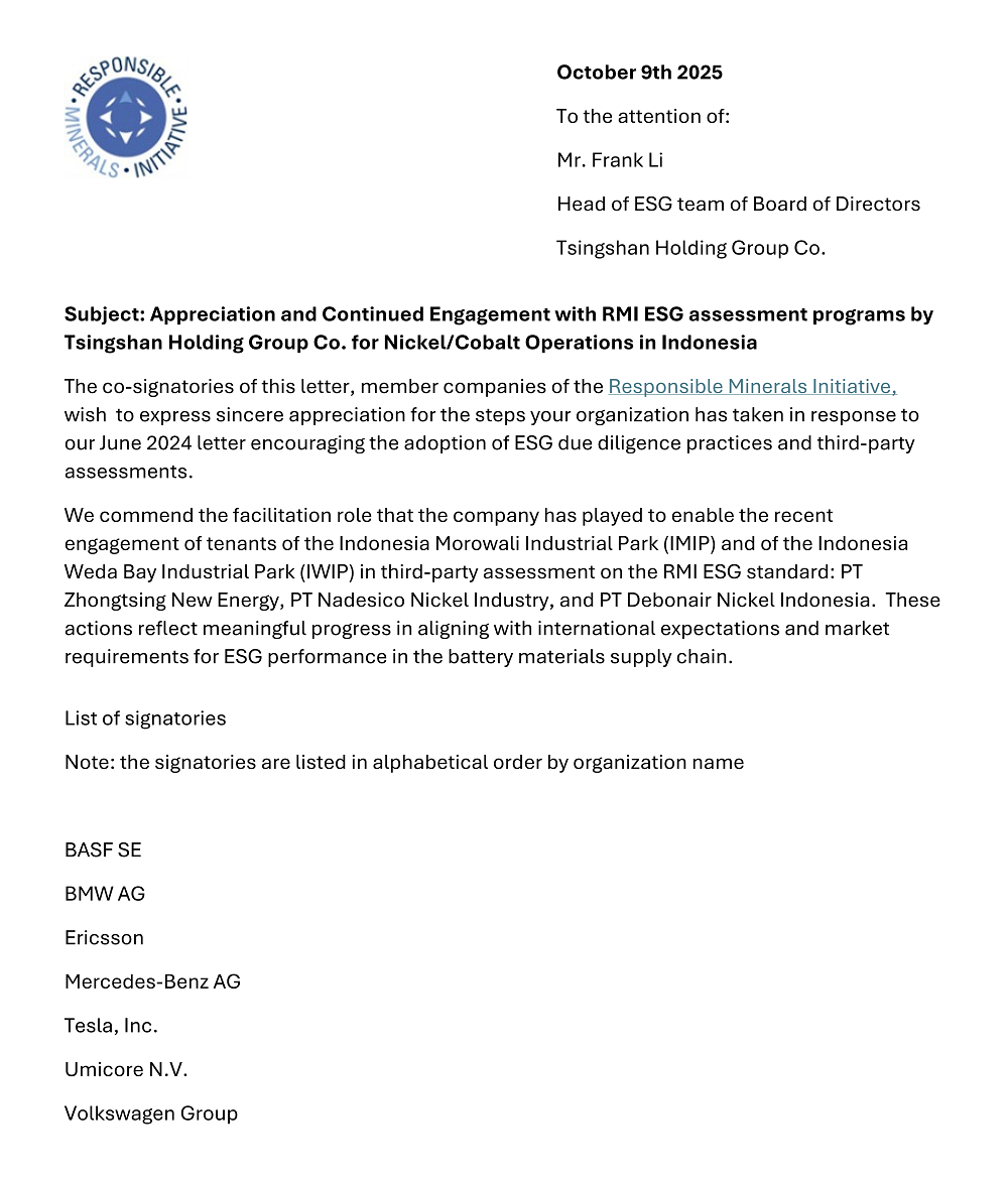 近期,青山實(shí)業(yè)董事局收到來自特斯拉、大眾、奔馳、巴斯夫、寶馬、愛立信及優(yōu)美科等多家負(fù)責(zé)任礦產(chǎn)倡議(RMI)成員單位及國際新能源終端客戶的聯(lián)合感謝信。信中對(duì)青山實(shí)業(yè)在環(huán)境、社會(huì)和治理(ESG)領(lǐng)域的實(shí)踐,尤其是在推動(dòng)供應(yīng)鏈透明度、負(fù)責(zé)任礦產(chǎn)采購及促進(jìn)行業(yè)協(xié)作等方面所做出的貢獻(xiàn),予以高度認(rèn)可。