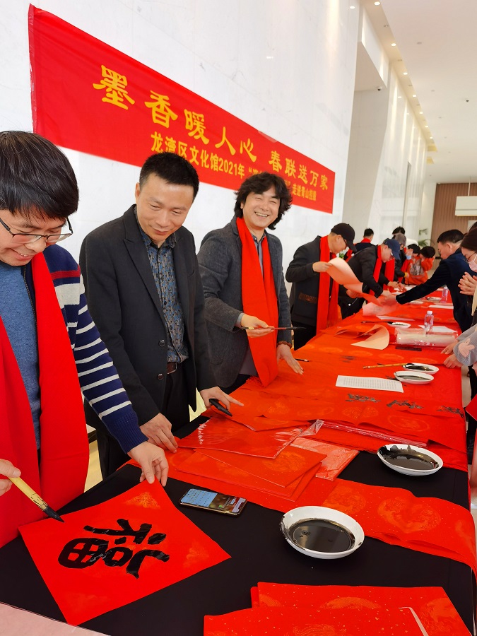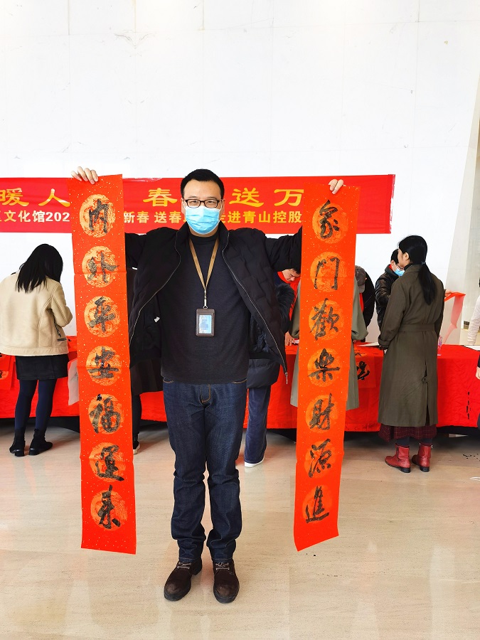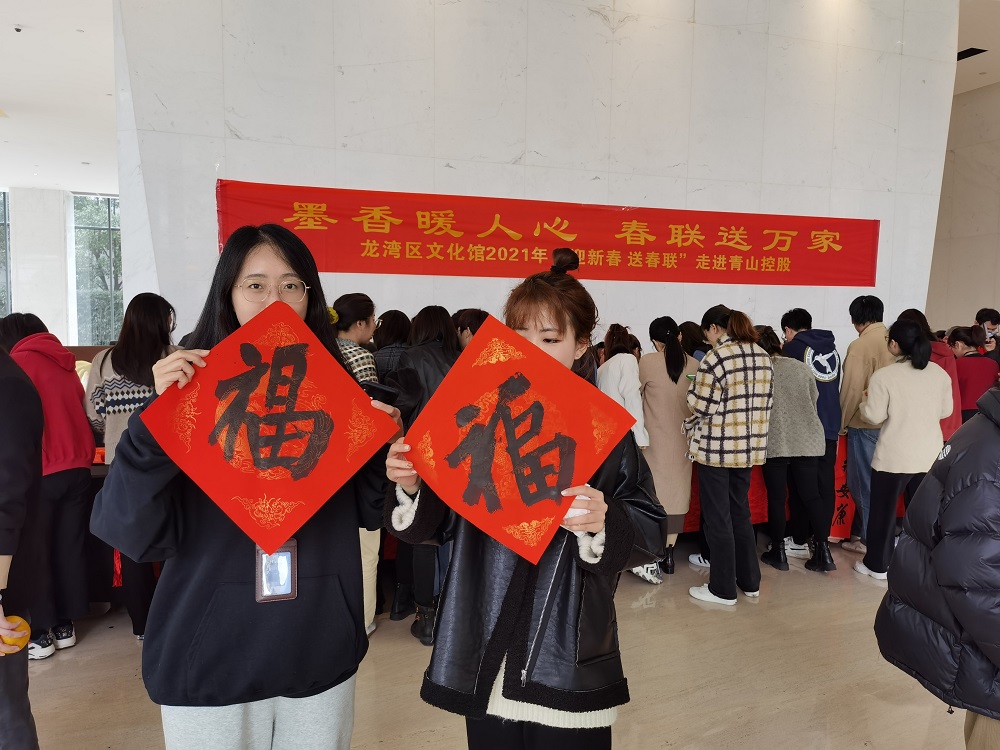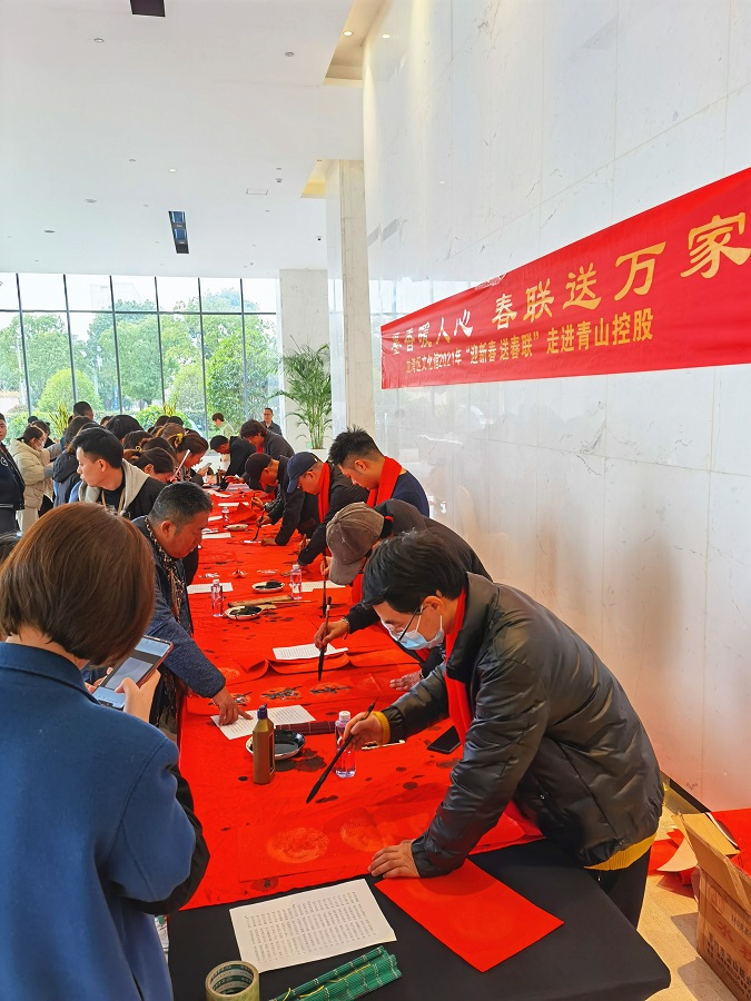 2月3日11時(shí),青山控股集團(tuán)有限公司聯(lián)合溫州市龍灣區(qū)文化館在青山總部大樓開展了2021年“迎新春 送春聯(lián)”活動。區(qū)文化館十余位書法家及愛好者來到了青山總部大樓,他們真情揮舞筆墨,為每位來到現(xiàn)場的員工送上一幅幅“新鮮出爐”的對聯(lián)和福字,活動現(xiàn)場熱鬧非凡。有些員工特地選好自己中意的對聯(lián)標(biāo)語,請書法老師專門為其書寫,現(xiàn)場還排起了隊(duì)伍。每位收到對聯(lián)和福字的員工都洋溢著幸福的笑臉,如獲珍寶。此次活動不僅營造了溫馨、濃厚的節(jié)日氛圍,也讓廣大員工感受到了傳統(tǒng)書法的真切魅力。