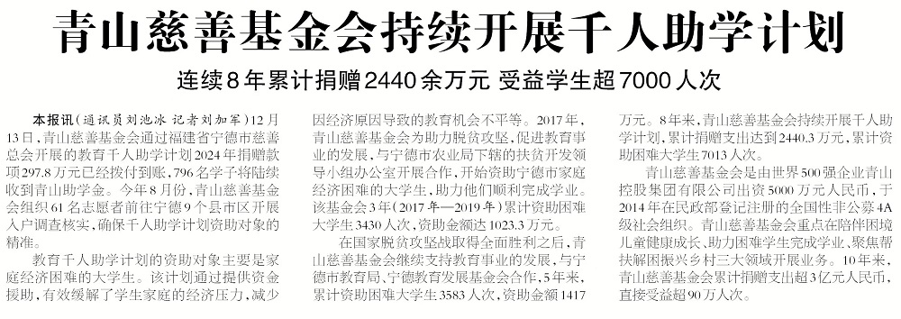 12月13日,青山慈善基金會通過福建省寧德市慈善總會開展的教育千人助學(xué)計劃2024年捐贈款項297.8萬元已經(jīng)撥付到賬,796名學(xué)子將陸續(xù)收到青山助學(xué)金。今年8月份,青山慈善基金會組織61名志愿者前往寧德9個縣市區(qū)開展入戶調(diào)查核實,確保千人助學(xué)計劃資助對象的精準(zhǔn)。