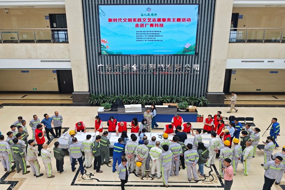 為弘揚社會主義核心價值觀與時代精神,持續(xù)豐富文明實踐活動內(nèi)涵和職工業(yè)余文化生活,5月29日,廣東廣青金屬科技有限公司攜手陽江市文聯(lián)、陽江市文藝志愿者協(xié)會,在公司四樓大禮堂舉辦“廣拓新程·青揚藝彩”新時代文明實踐文藝志愿服務(wù)展演。市文聯(lián)黨組書記、主席葉秀華,公司黨委委員、副總經(jīng)理楊洋,市文聯(lián)、市文藝志愿者協(xié)會相關(guān)負責(zé)人以及來自各廠部職工代表約400多人共賞文化盛宴。