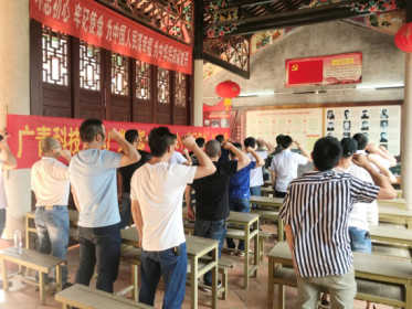 在中共陽江縣委舊址(丹載村許氏宗祠),黨支部書記戴作銳帶領(lǐng)全體黨員及入黨積極分子重溫入黨誓詞,讓大家進(jìn)一步堅定“不忘初心,牢記使命”的決心與信念。