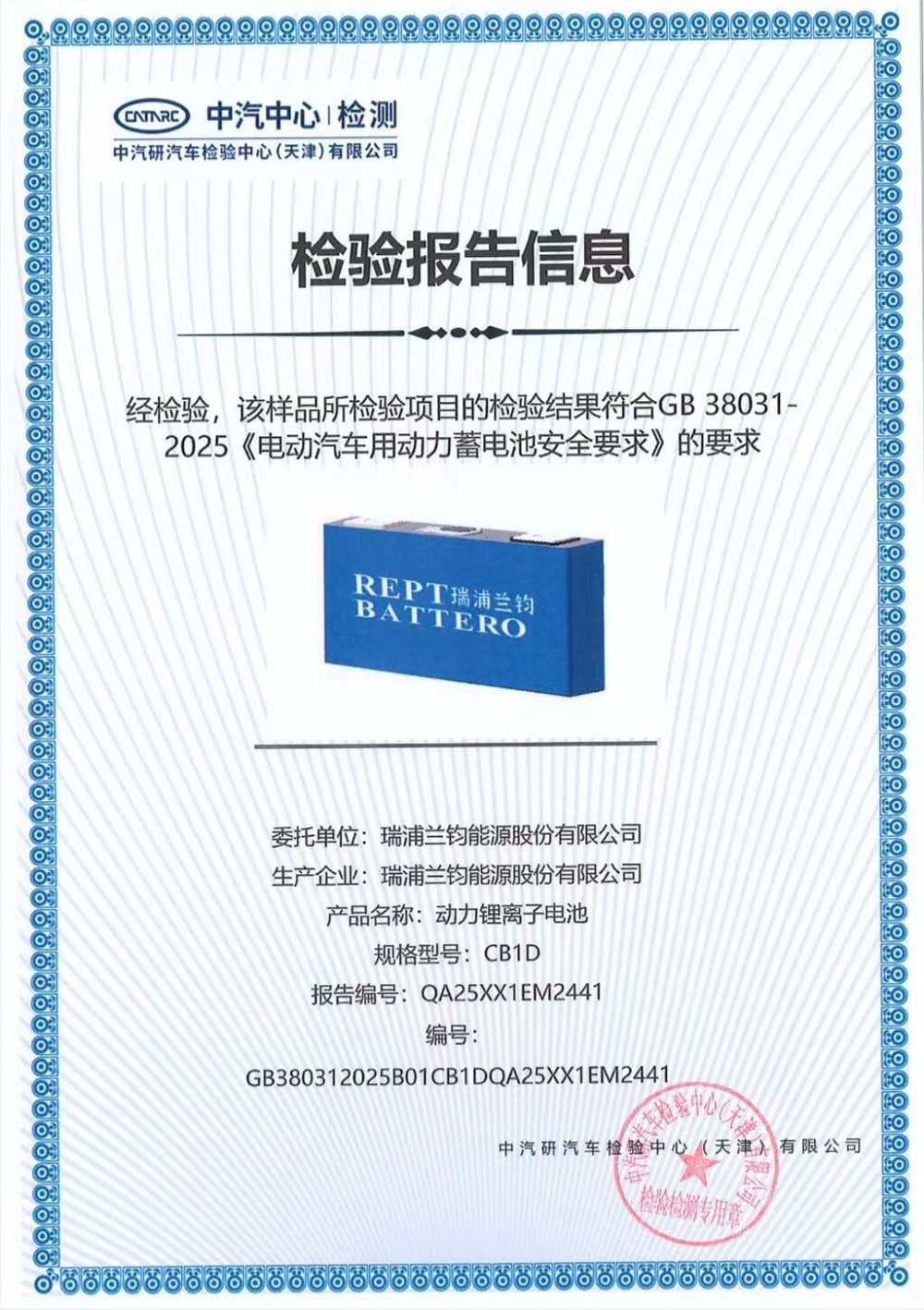 瑞浦蘭鈞能源股份有限公司旗下PHEV系列問頂54Ah電芯產(chǎn)品率先通過新國標(biāo)認(rèn)證(《GB38031-2025 電動汽車用動力蓄電池安全要求》),瑞浦蘭鈞成為行業(yè)首批達(dá)標(biāo)企業(yè)。
