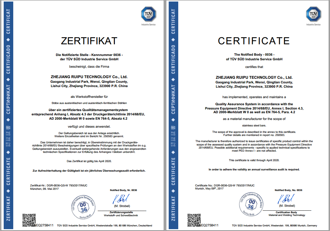 5月17日,經(jīng)過TüV SüD南德認(rèn)證檢測(中國)有限公司前期的一系列現(xiàn)場審核、產(chǎn)品試驗以及后期德國TüV SüD 總部的審核,浙江瑞浦科技有限公司順利獲得了TüV SüD總部頒發(fā)的PED和ADWO認(rèn)證證書。