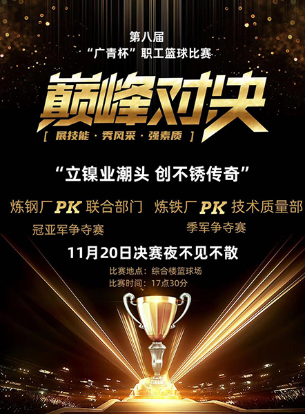 11月20日晚,第八屆“廣青杯”籃球比賽經(jīng)過9天的緊張角逐圓滿結(jié)束,廣東廣青金屬科技有限公司300多名員工觀看了冠亞軍決賽。