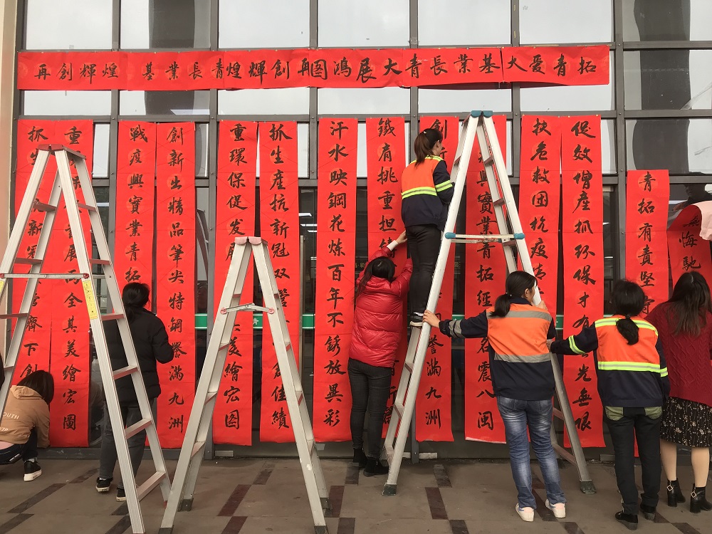 工作人員將春聯(lián)掛在青拓科技食堂門口,寓意福駐青山。