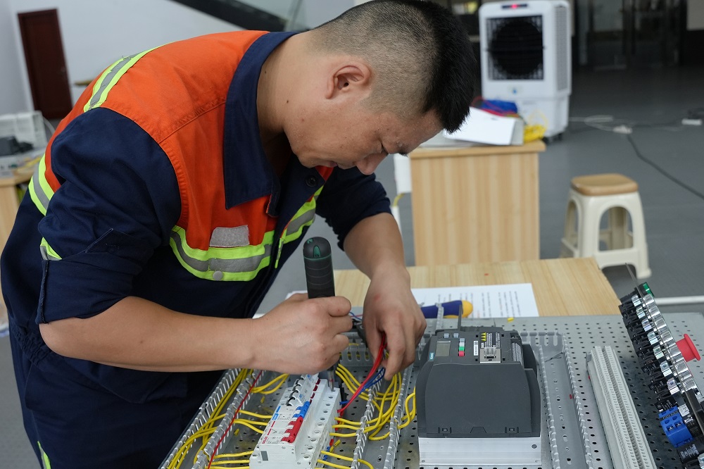 電工比賽現(xiàn)場,選手們爭分奪秒地清點比賽用具、認真審題、畫圖、“穿針引線”,精細的零件在他們手中運用自如。